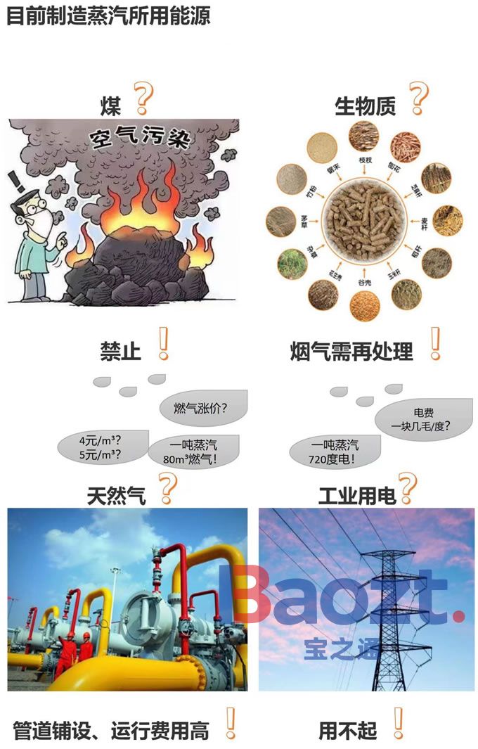 煤已经禁止,生物质很多地方不给烧,主流的就是用天然气来制造蒸汽,直接用电制造蒸汽的比较少,因为电费用不起(低价电地区除外),也有部分企业用电厂管道蒸汽,但是也会有各种限制。